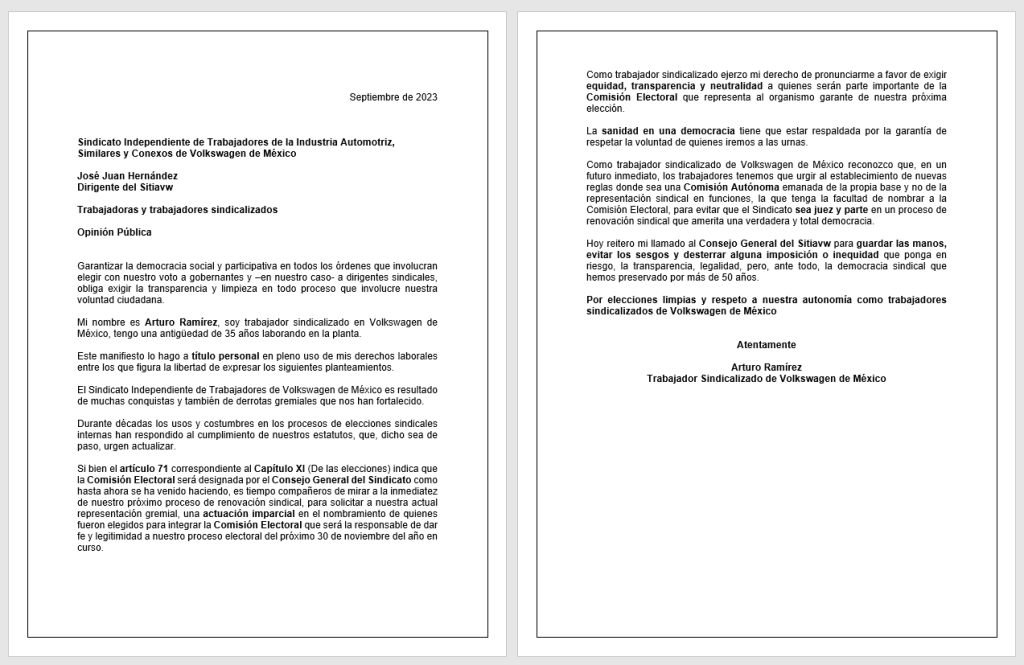 Como trabajador sindicalizado de Volkswagen de México reconozco que, en un futuro inmediato, los trabajadores tenemos que urgir al establecimiento de nuevas reglas donde sea una Comisión Autónoma emanada de la propia base y no de la representación sindical en funciones, la que tenga la facultad de nombrar a la Comisión Electoral, para evitar que el Sindicato sea juez y parte en un proceso de renovación sindical que amerita una verdadera y total democracia.