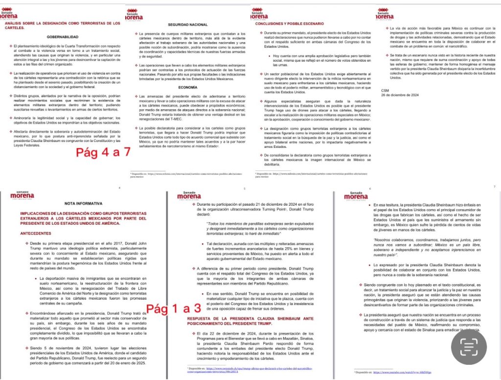 También reprueba la intención de Trump de clasificar como organizaciones terroristas a los cárteles mexicanos, lo que pone en riesgo, dice el documento, la soberanía y política que se ha defendido en los dos últimos mandatos del país (Andrés Manuel López Obrador y Claudia Sheinbaum).