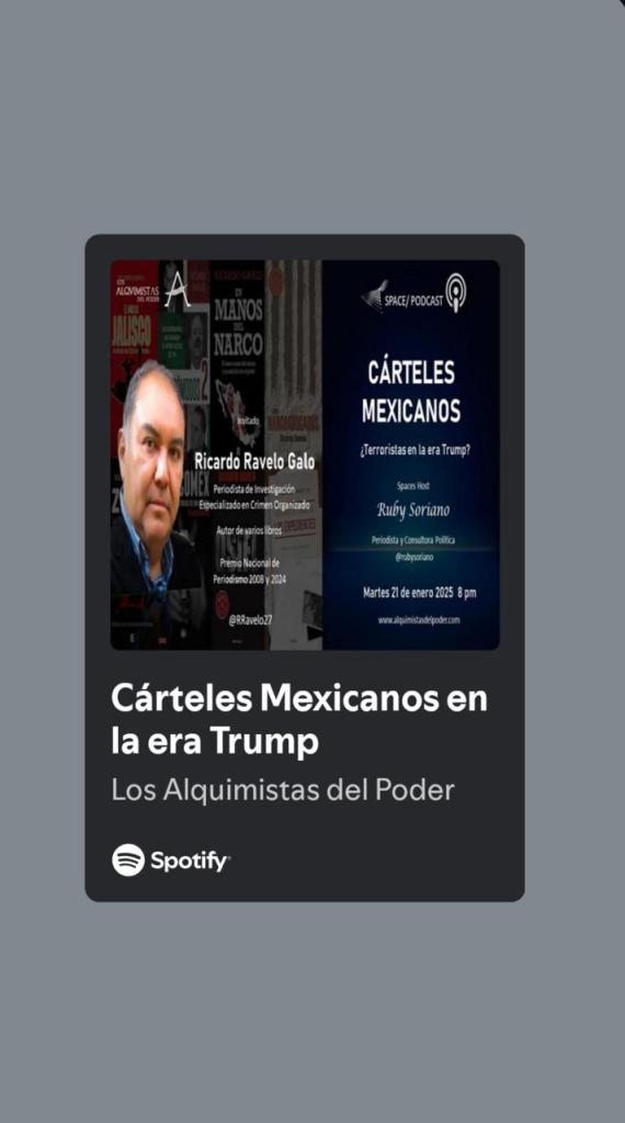 Podcast Cárteles Mexicanos ¿terroristas en la era Trump? Fecha: 22 de enero, 2025Autor/a: alquimistasdelpoder 0 Comentarios Comparte esto: Haz clic para compartir en X (Se abre en una ventana nueva) X Haz clic para compartir en Facebook (Se abre en una ventana nueva) Facebook Me gusta Cargando... Relacionado
