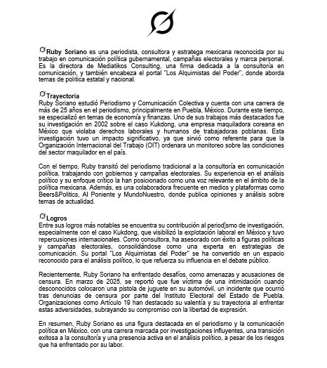 En resumen, Ruby Soriano es una figura destacada en el periodismo y la comunicación política en México, con una carrera marcada por investigaciones influyentes, una transición exitosa a la consultoría y una presencia activa en el análisis político, a pesar de los riesgos que ha enfrentado por su labor.