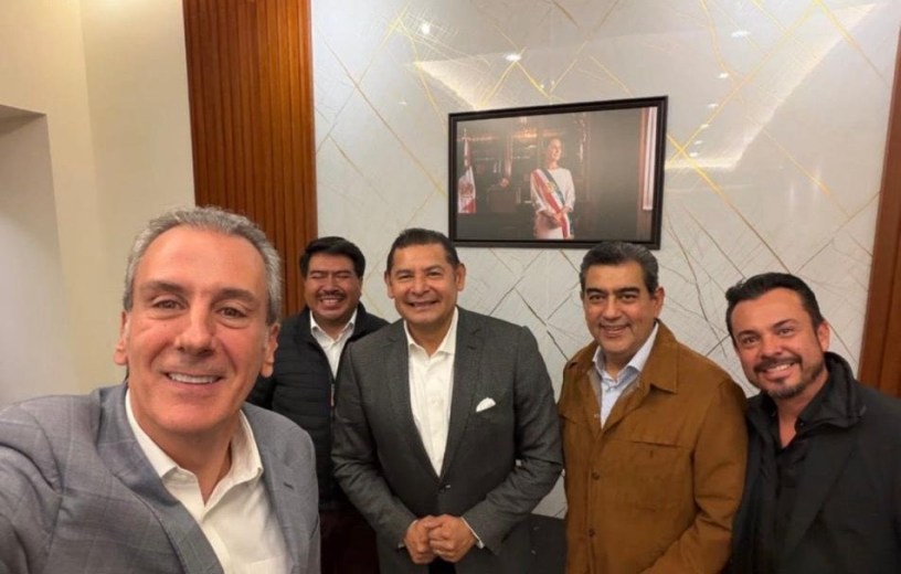 Javier Aquino, el edil Pepe Chedraui, el gobernador Alejandro Armenta, el responsable de Migración y ex gobernador poblano Sergio Salomón y José Luis García, Coordinador del gabinete del gobierno del estado, juntos en una reunión.